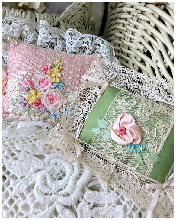 ハンドメイド ミニクッション ハンドメイドのピンクッション♡2個セット レースとリボン刺しゅう♪ヴィクトリアンな手作り ミニクッションその他インテリア雑貨 chisatofactory 通販 15218801Creema クリーマ。
