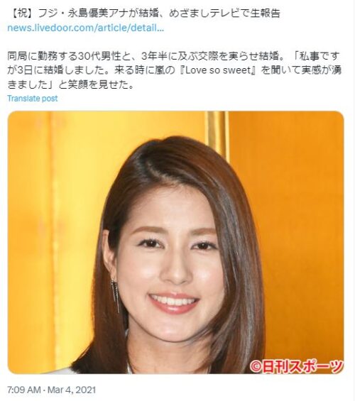 永島優美アナがフジテレビのディレクターと結婚。交際3年で入籍、父親・永島昭浩の反応は 夫の顔画像あり今日の最新芸能ゴシップニュースサイト芸トピ。