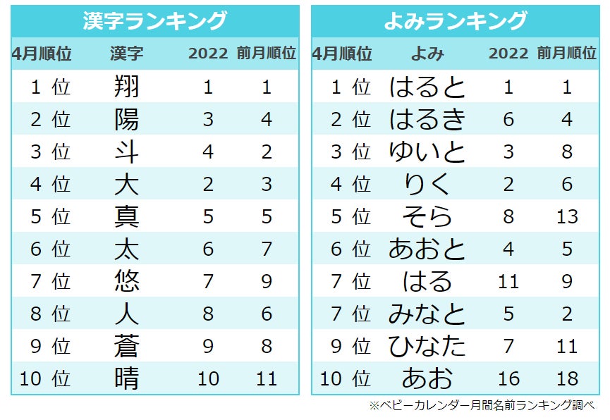たまひよ 赤ちゃんの名前ランキング2022 男の子「碧」初の1位獲得、女の子「陽葵」7年連続1位! ジェンダーレスな名前で人気なのは1位「あおい」2位「ひなた」干支・寅年にちなんだ「琥太郎」「虎太郎」「大雅」「大河」も今年の特徴たまひよ。