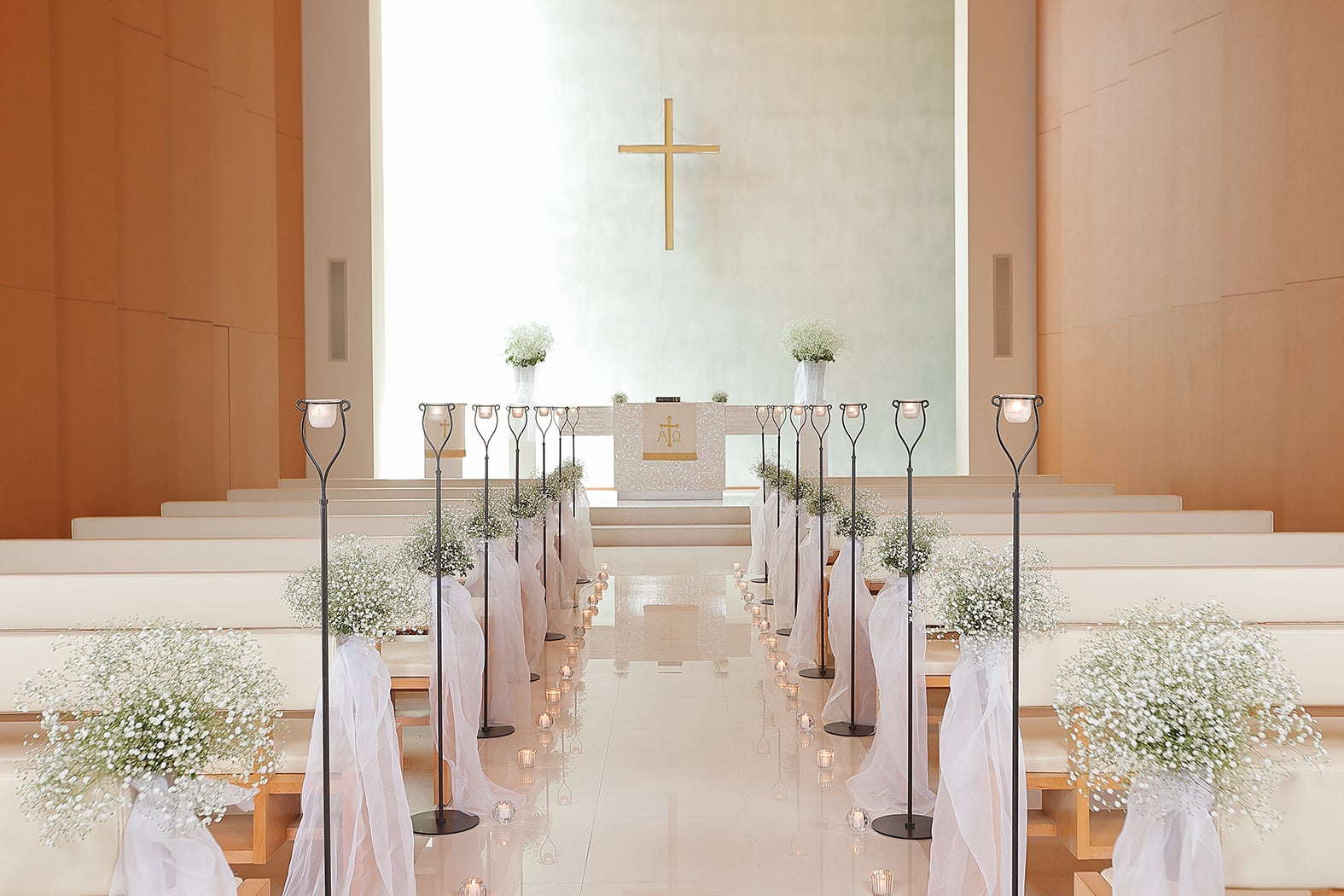 バージンロードを彩るチャペル装花のデコレーションまとめ。