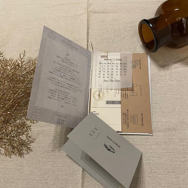 事前にタクシーチケットを招待状に同封したり、結婚式当日手渡しする場合は、ミニ封筒やオリジナルのホルダーに入れてお渡しするのがおススメ🚘 チケットは名刺サイズなので、ポケットに入る程度の大きさで、可愛く手作りしてみてくださいね。