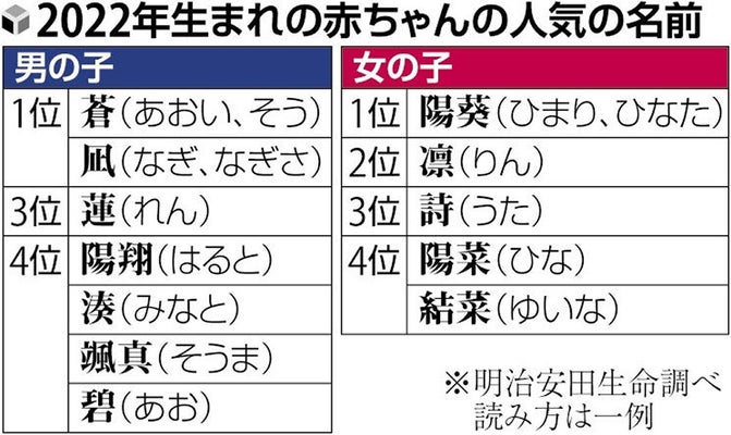 赤ちゃんの名前ランキング、男の子トップは「蒼」と「凪」 女の子は「陽葵」 : 読売新聞。