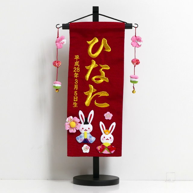 吊るし雛&名前旗セット 名前旗 女の子 刺繍 芯木タイプ うさぎ雛名前旗台付きセット名前 生年月日入代込のし・ラッピング対応可 お雛様ひな祭り 雛人形 節句 命名 旗 名入れ プレゼント 被布着付き 送料無料 -京都 西陣織元 もりさん - プレゼント&ギフト。