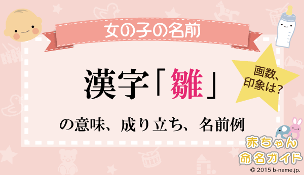 雛」の漢字の意味や成り立ち、音読み・訓読み・名のり・人名訓から、「雛」の漢字を使った女の子の名前例名前を響きや読みから探す赤ちゃん名前 辞典完全無料の子供の名前決め・名付け支援サイト「赤ちゃん命名ガイド」。