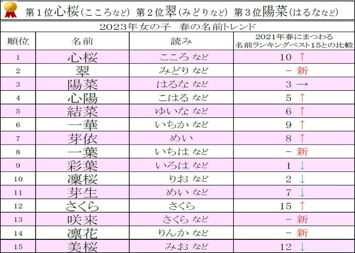 2023年「4月生まれ赤ちゃん」の人気名前ランキング、女の子1位は「美桜」 - 男の子は?マイナビニュース。