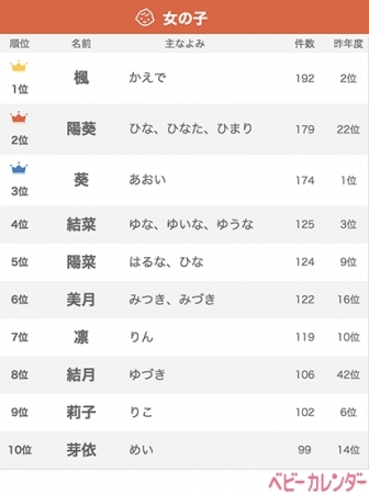 女の子は自然派ネームが圧倒!「2017年生まれの赤ちゃんの名前ランキング」発表株式会社ベビーカレンダーのプレスリリース。