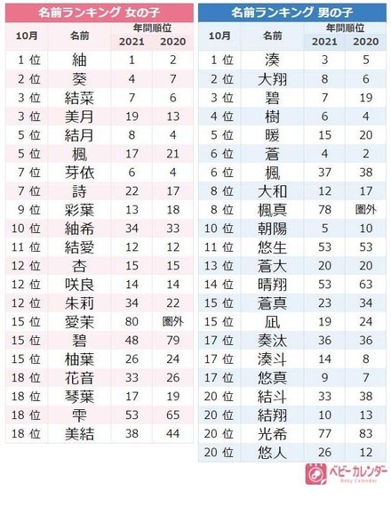 2021年上半期 人気の名前ランキングTOP20!今女の子に最も人気の名前は? ベビーカレンダ。