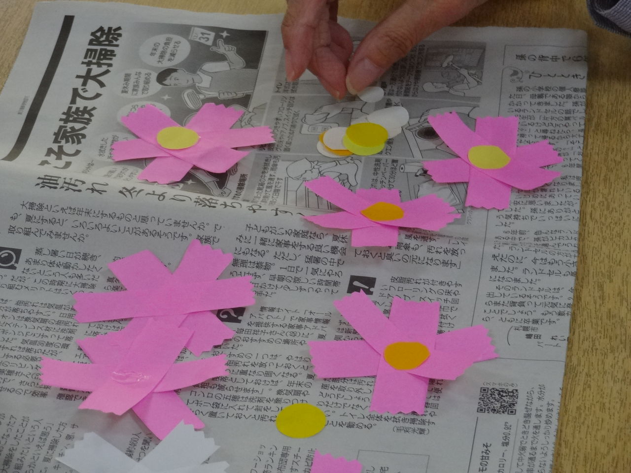高齢者レク 9月 コスモス壁飾り 簡単製作 Cosmos wall decoration。
