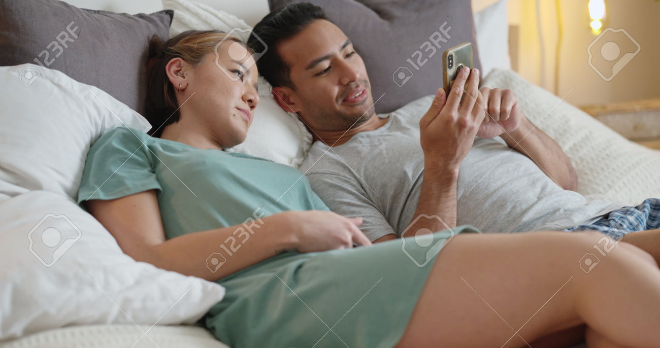 ベッドで夫婦、スマートフォンとソーシャルメディア、寝室で面白いオンラインミームの投稿で一緒に微笑む。電話を持つ幸せな男性、家で幸せに微笑む女性、週末の朝に一緒にリラックスの写真素材・画像素材Image 193002396。