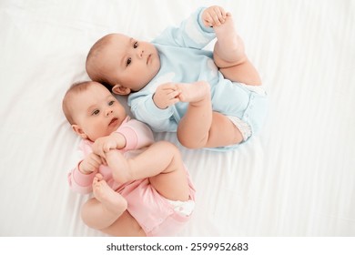 2人のかわいい双子の赤ちゃんがうれしそうに微笑んでいる。前向きなライフスタイルのコンセプト。幸せな子ども時代写真素材1086814028Shutterstock。