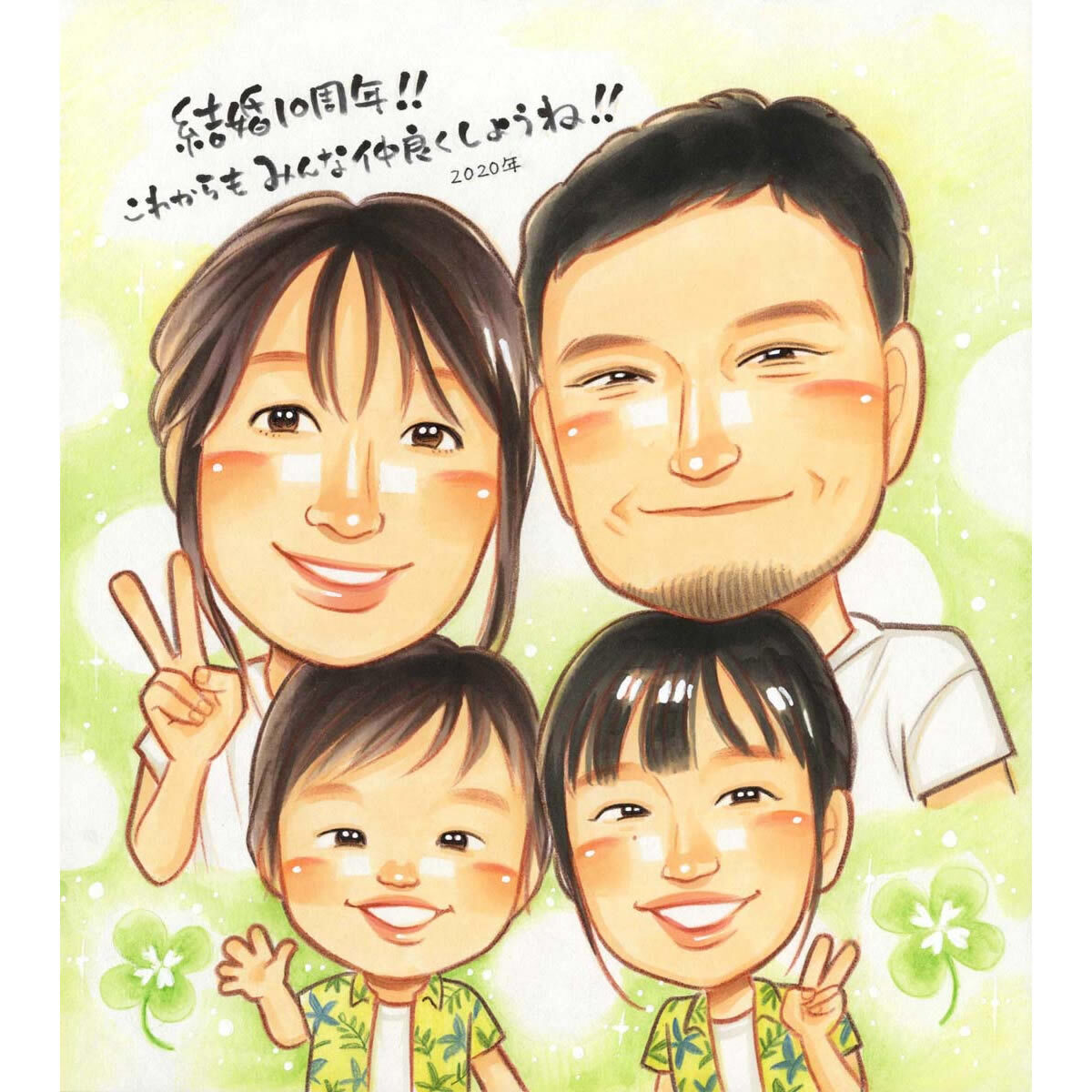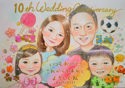 結婚10周年を家族でお祝い似顔絵 結婚記念日を記念写真のかわりに似顔絵で きよら 似顔絵 プレゼント お祝い 還暦 古希 喜寿 傘寿 米寿 卒寿 長寿結婚祝い 結婚記念日 金婚 結婚10周年 誕生日 結婚式 結婚祝い 定年 退職 送別 卒業 大人数 両親 父 母 祖父 祖母 家族 男性。