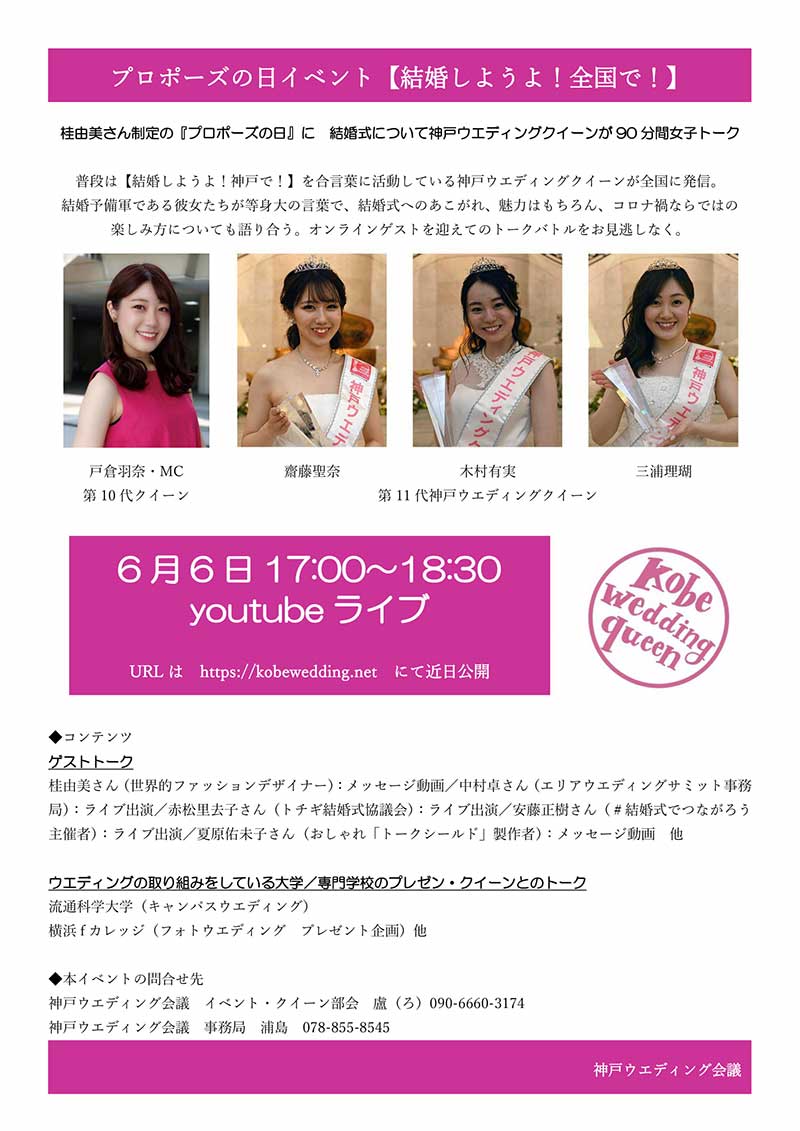 6月6日17:00~プロポーズの日オンラインライブイベント開催!神戸ウエディング会議結婚しようよ神戸で!kobewedding.netは、神戸が大好きなカップルのためのサイトです。