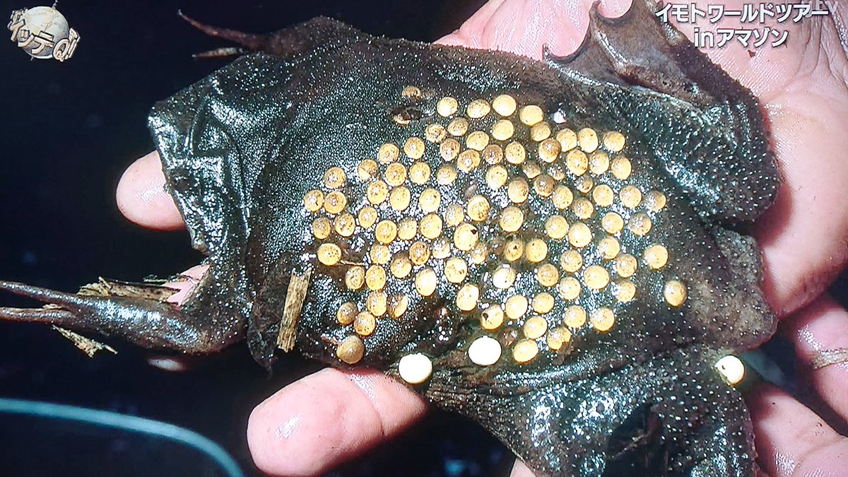 あまのじゃくとへそまがり on X: " コモリガエルのポーチPipa pipa アマゾン川流域に生息するひらべったいカエル。体長15㎝。前脚の指先が星形の感覚器官で、バンザイの姿勢で枯葉のように川底にひそむ。 メスは背中の皮膚に受精卵を埋め込んで、孵化。