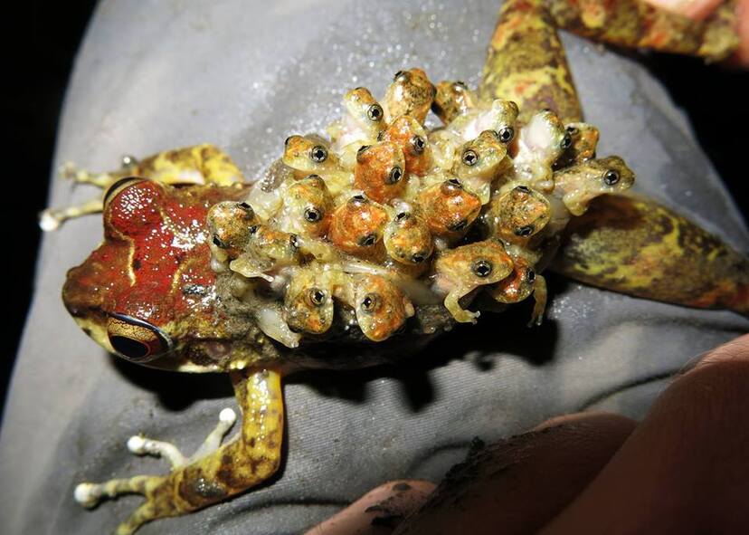 背中から子どもがポコポコ生まれてくるコモリガエル。