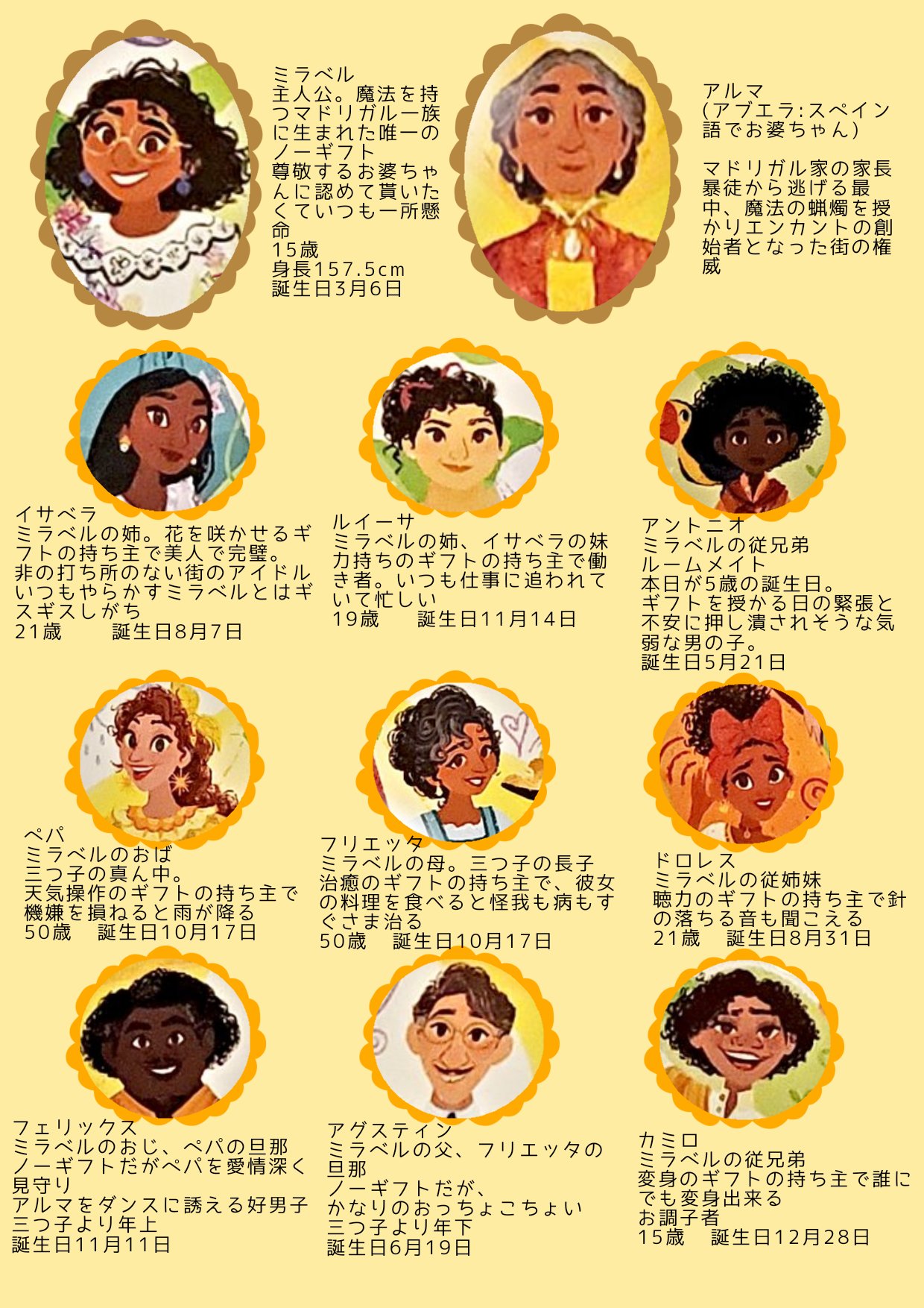 隻緋 せきひon X: "ネタバレなしのキャラ紹介を作りました❗️ マドリガル多すぎるから11月17日の金ローに向けてどうぞ✨年齢と身長、誕生日はジャレッド監督のツイートからミラベルと魔法だらけの家金ローミラベル https:t.co EC09sQY25V"X。