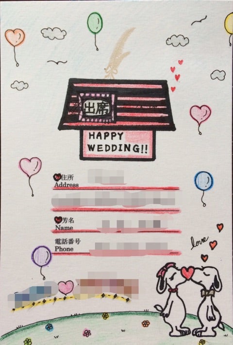 結婚式招待状の返信ハガキにスヌーピー♡*zunko* 〜北欧マリメッコのハンドメイドとネイルといろいろ。