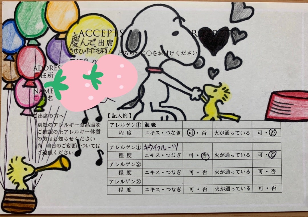 結婚式の招待状の返信をSNOOPYで埋め尽くしてみた!!大阪市キャラ弁教室 栄養満点でバランスの良いキャラ弁でお子様を笑顔に。