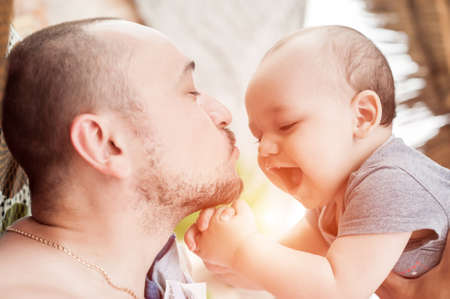 父と息子は一緒に時間を過ごします。親子関係。お父さんと子供が遊んで抱きしめる。太陽の下で幸せな家族。の写真素材・画像素材 Image 106602357。