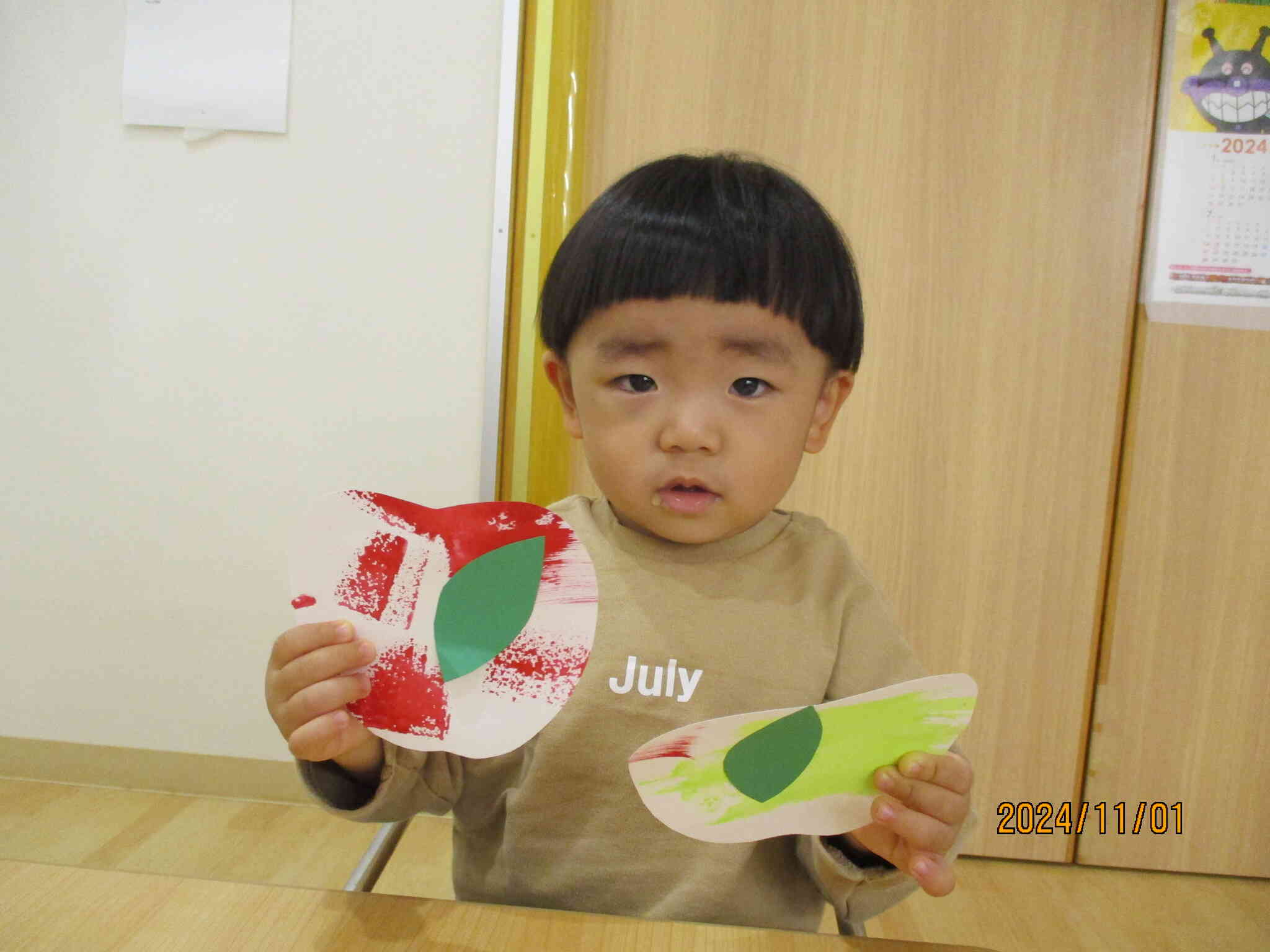 真っ赤なリンゴ🍎おいしそうでしょ! 1歳児 すずめ組– 鎧郷保育園。