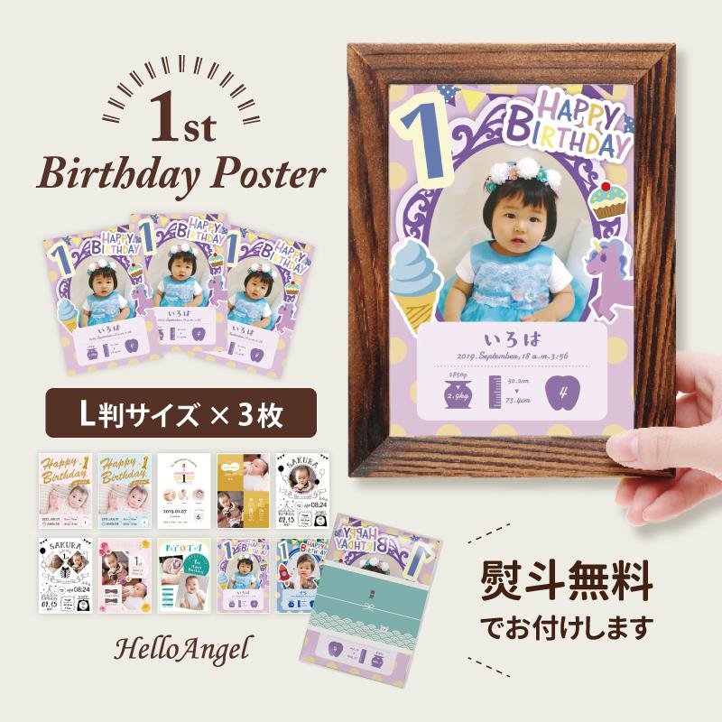 ハローエンジェル 1歳バースデーポスター L判サイズ3枚セット メール便送料無料 バースデーカード 手作り オーダー 写真 1歳 誕生日 一升餅誕生日 メッセージ。