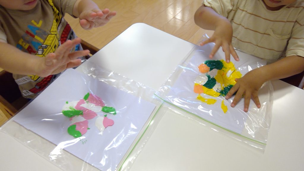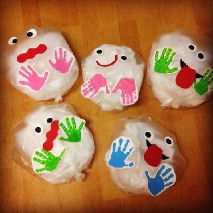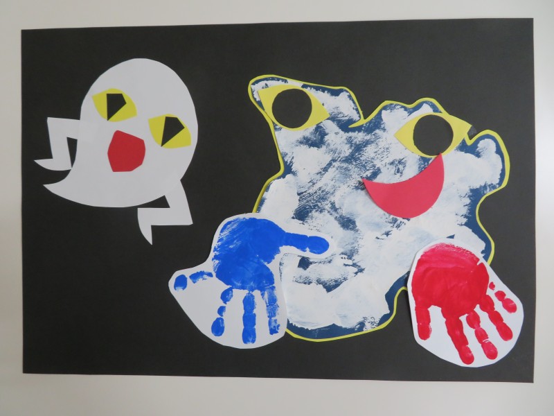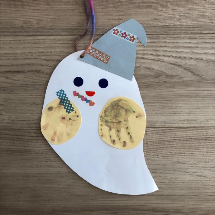 絵の具の感触を楽しむ手形「おばけ」世界文化ワンダ。