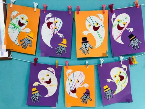 𖠿𖥧 ▷ 10がつの壁面製作 絵の具を使ったファーストアート風おばけ👻 参考にしてください𓂃𓈒𓏸 作ってみたよ!というかたはぜひDMで教えてください♡ みんなの作品見せてね🥰 コメントや質問も待ってまーす ✈︎ * * ご覧いただきありがとう。