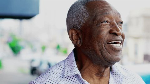カメラの笑顔を見て幸せなアフリカ系アメリカ人の高齢者の接写。親しみやすいカリスマ的な黒人のシニアのブラジル男性」の動画素材 ロイヤリティフリー 1106190711Shutterstock。