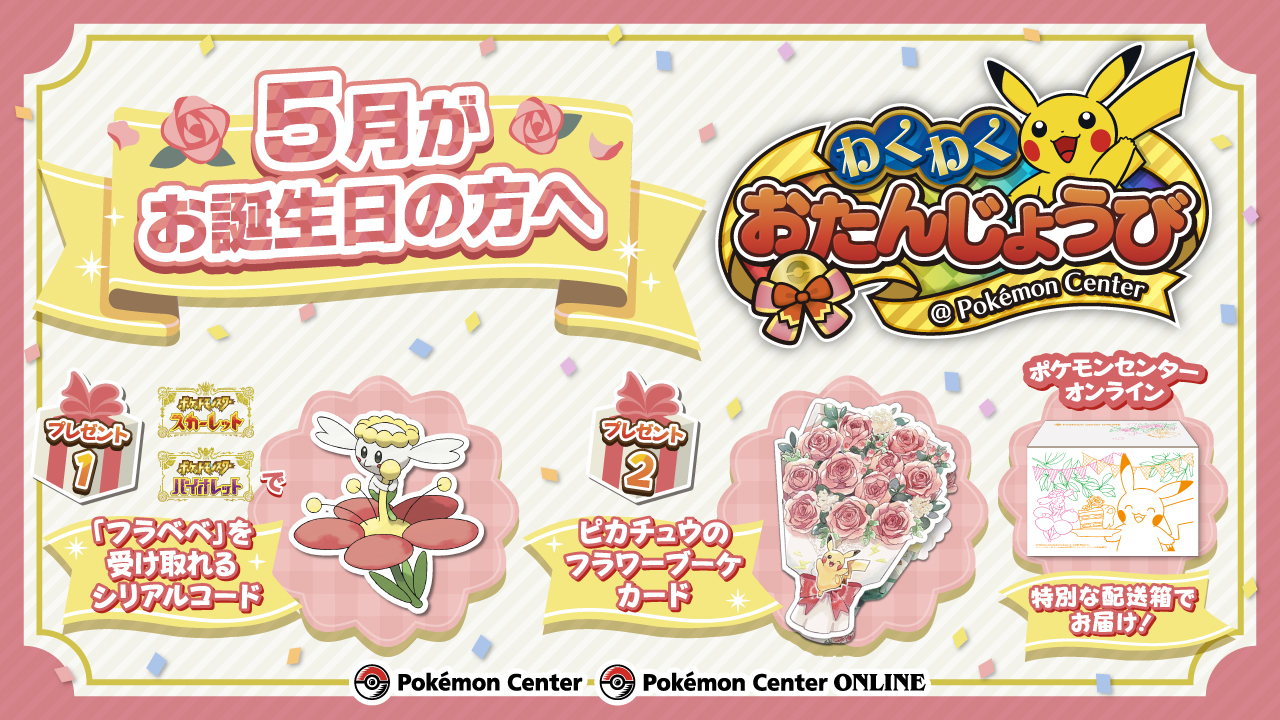 ポケモンセンター公式 on X: "5月がお誕生月のお友だちにお知らせだよ! お誕生月にポケモンセンターオンライン でお買い物、もしくはポケモンセンターにお誕生日を証明するものを持っていくと、「ポケモンセンターわくわくおたんじょうび」サービスが受けられるよ。
