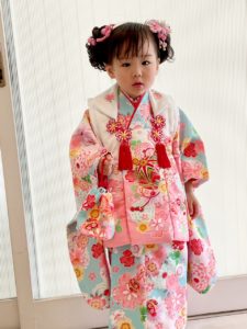 七五三 3歳人気のツインテール西宮駅すぐ レンタル衣装 近藤衣裳店。