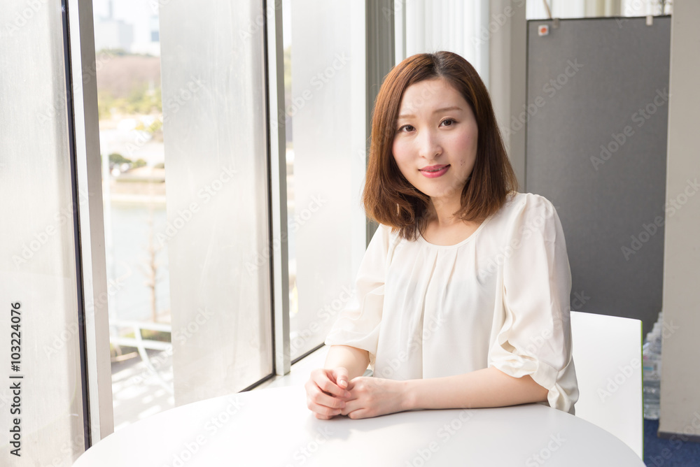 テーブルに座る20代女性 10626001058 の写真・イラスト素材アマナイメージズ。