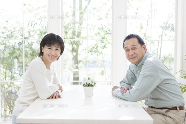 テーブルに向き合って座る中高年夫婦 11004102434 の写真・イラスト素材アマナイメージズ。