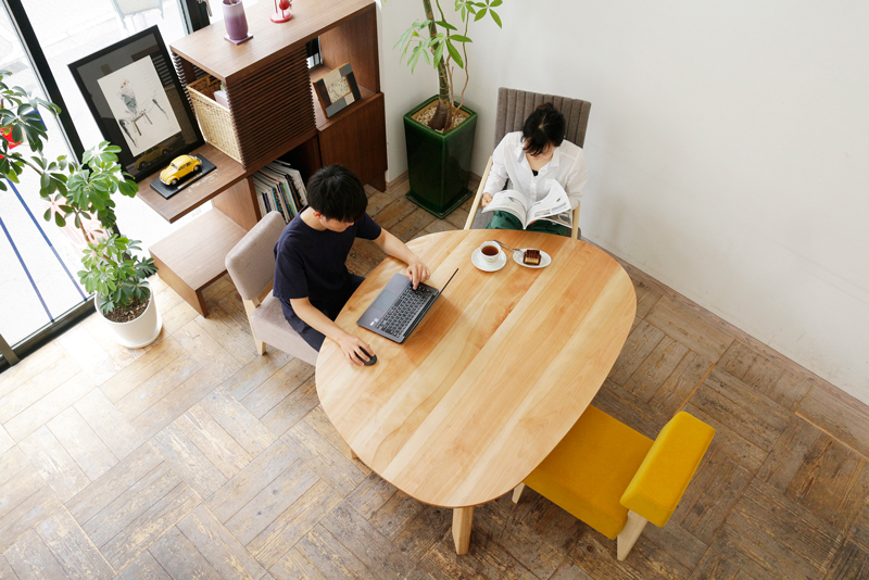 円形テーブルだからこそ感じる、座る位置に縛られない自由と、広いテーブルトップの快適さ - H邸スタイル。