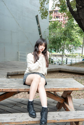 フリー写真あごに指を当ててテーブルの上に座る台湾人女性パブリックドメインQ:著作権フリー画像素材集。