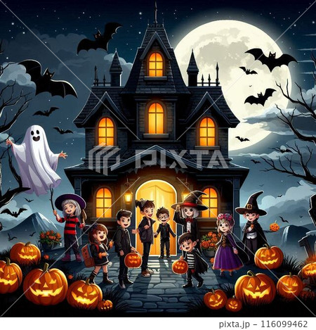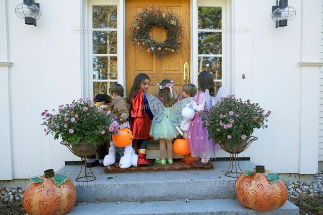 ハロウィーン衣装を着て家を訪ねる子供達 24003000358 の写真・イラスト素材アマナイメージズ。