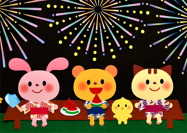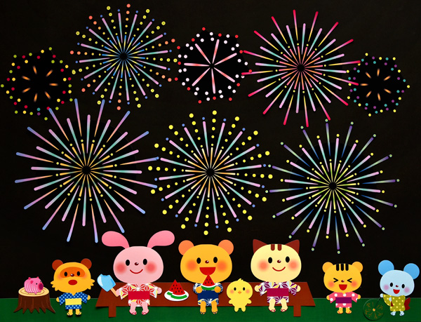 壁面飾り工房本店 壁面装飾・パネルシアター・ペープサート・型紙・知育・保育・介護商品の販売☆壁面飾り工房横80cm 「花火きれいだね!」7月 8月 夏 幼稚園 保育園 学校 病院 施設 知育 壁面装飾 型紙 製作☆。