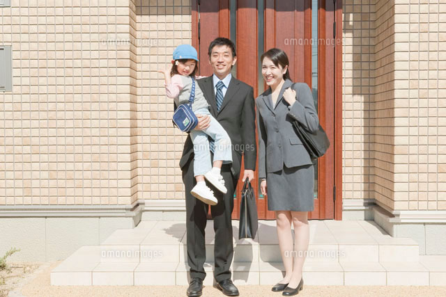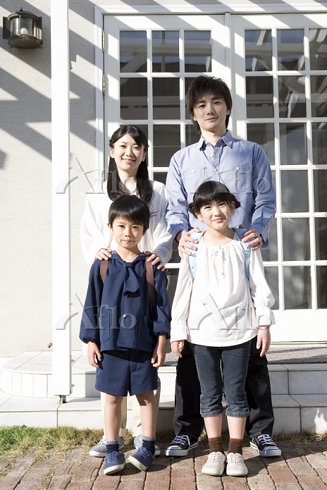 玄関前に立つ家族 10142001115 の写真・イラスト素材アマナイメージズ。