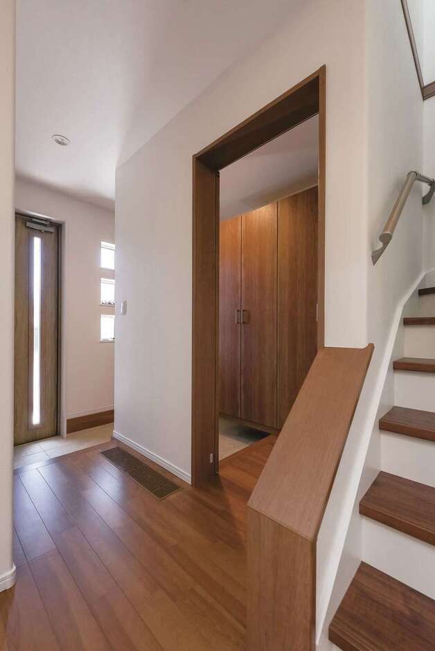 来客用と家族用の動線を分けた2WAY玄関。家族用のホールには収納も完備 くふうイエタテ。
