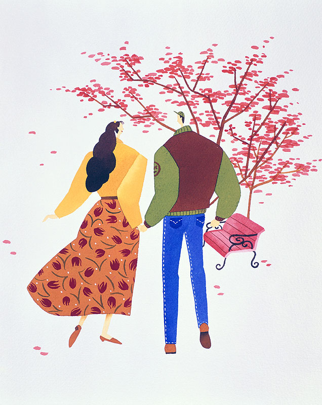 カップルイラスト 紅葉の木に向かって手をつなぎ歩く男女。