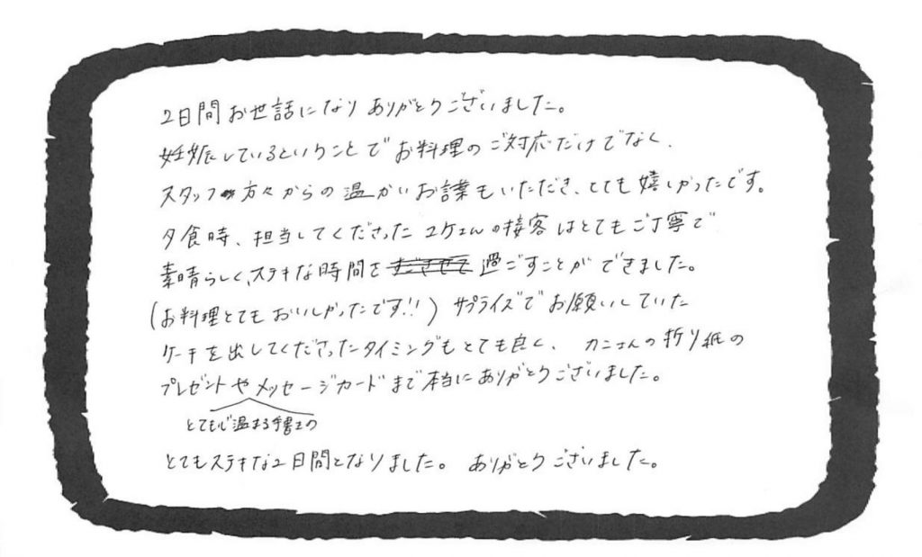 2日間お世話になりありがとうございました。カップル旅行泉翠。