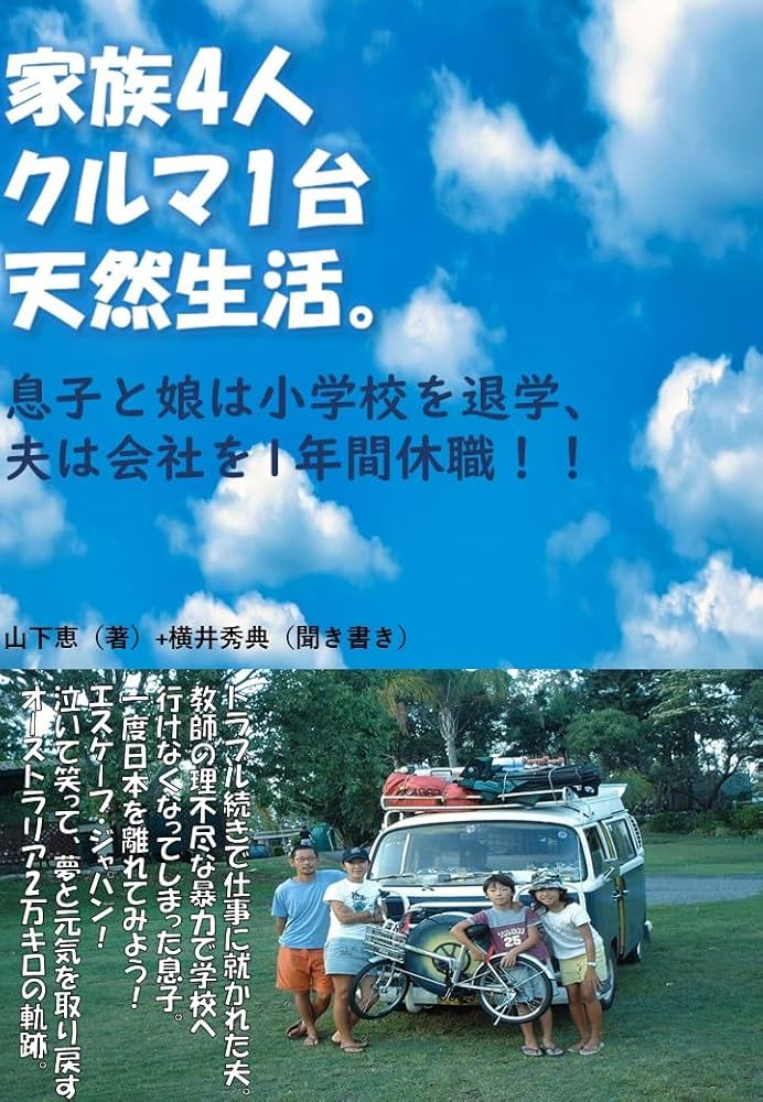 Amazon.co.jp: 家族4人クルマ1台天然生活。: 息子と娘は小学校を退学、夫は会社を1年間休職!! eBook : 山下恵, 横井秀典: 本。
