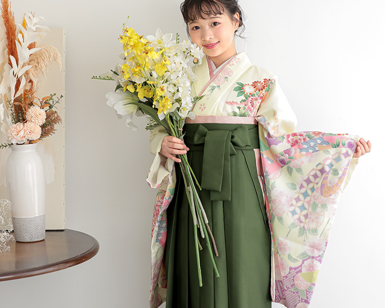 赤地に花尽くし・緑袴 刺繍小学生卒業式宅配着物レンタルの京都かしきもの。