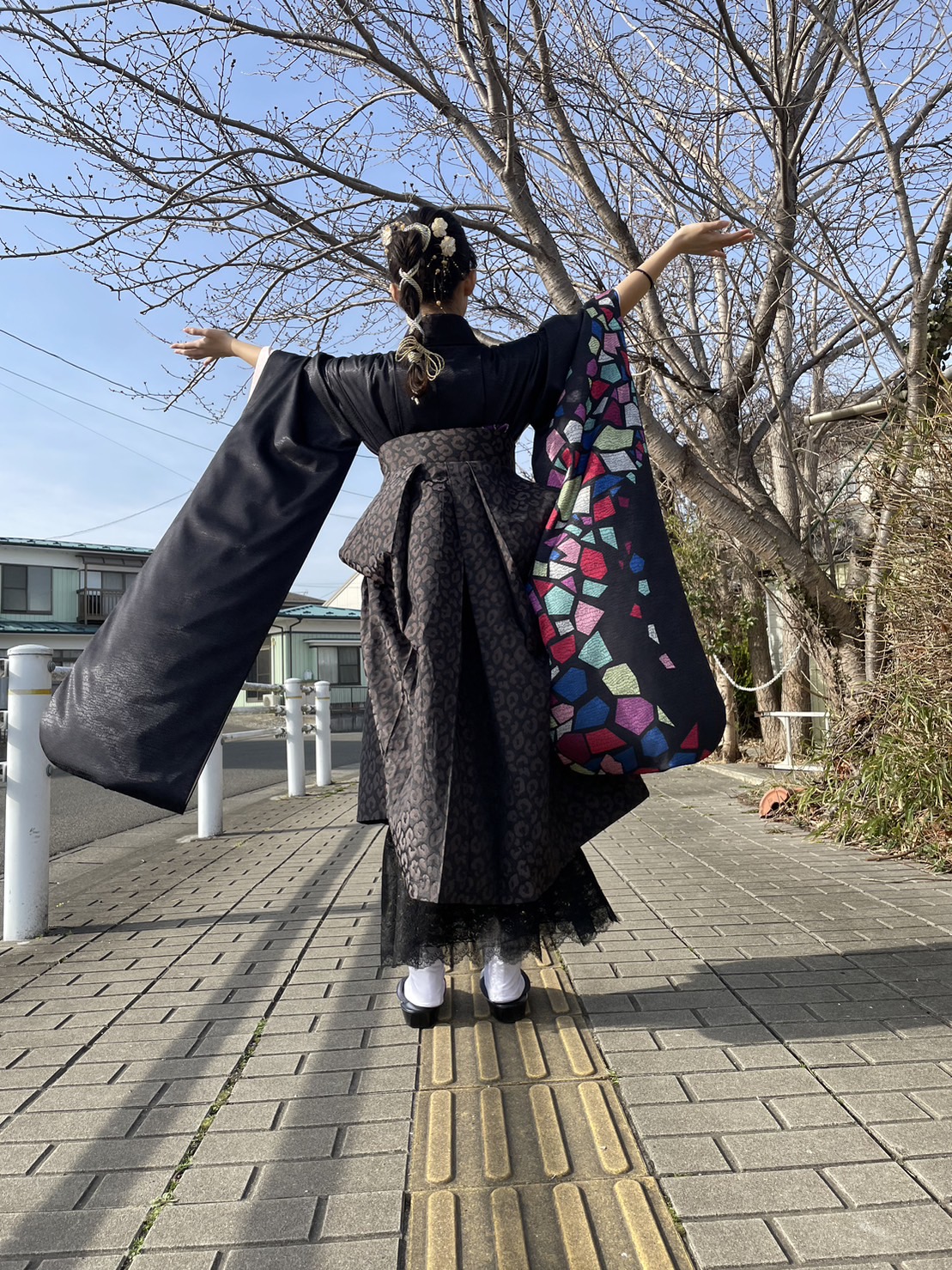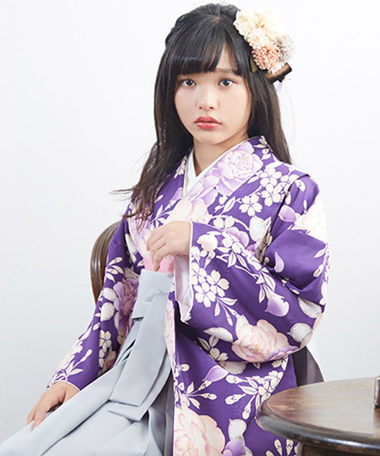小学生卒業式袴レンタル 女の子 9382黒地花丸×パープル袴着物レンタルの京都かしいしょう。