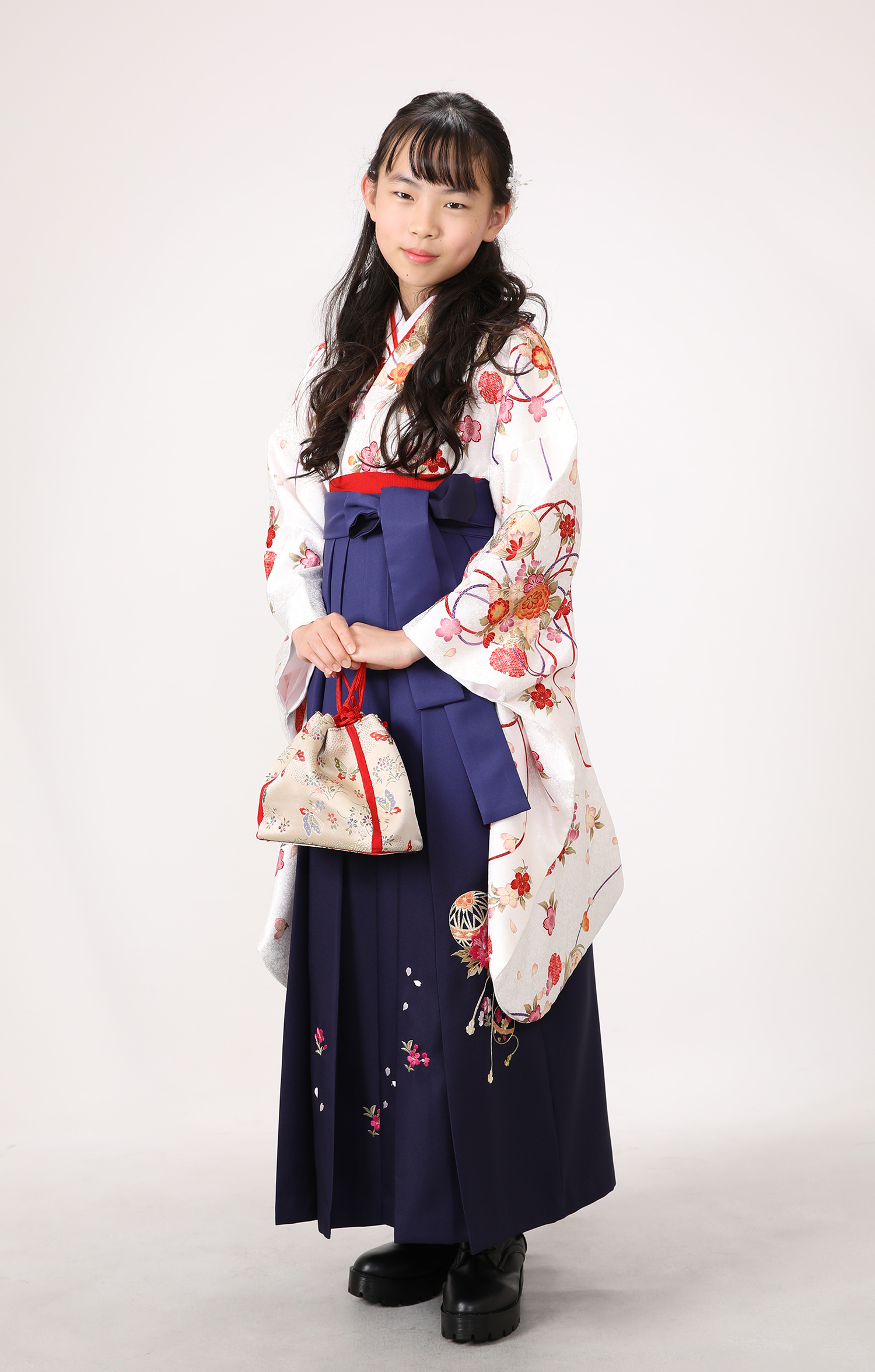 小学校卒業式 小さめ 女の子 袴レンタル h1267 ジュニア着物 フルセット レンタル袴 着物レンタル 卒業式 卒業袴 女子 コスプレ 10歳11歳 12歳 イベント 謝恩会 ホワイトモダン慶華×紺市松袴-貸衣裳ぽえむ本店。
