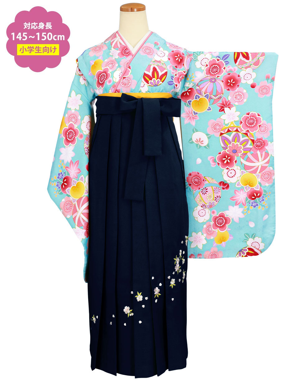 水色地に鞠と桜・紺袴 刺繍小学生卒業式宅配着物レンタルの京都かしきもの。