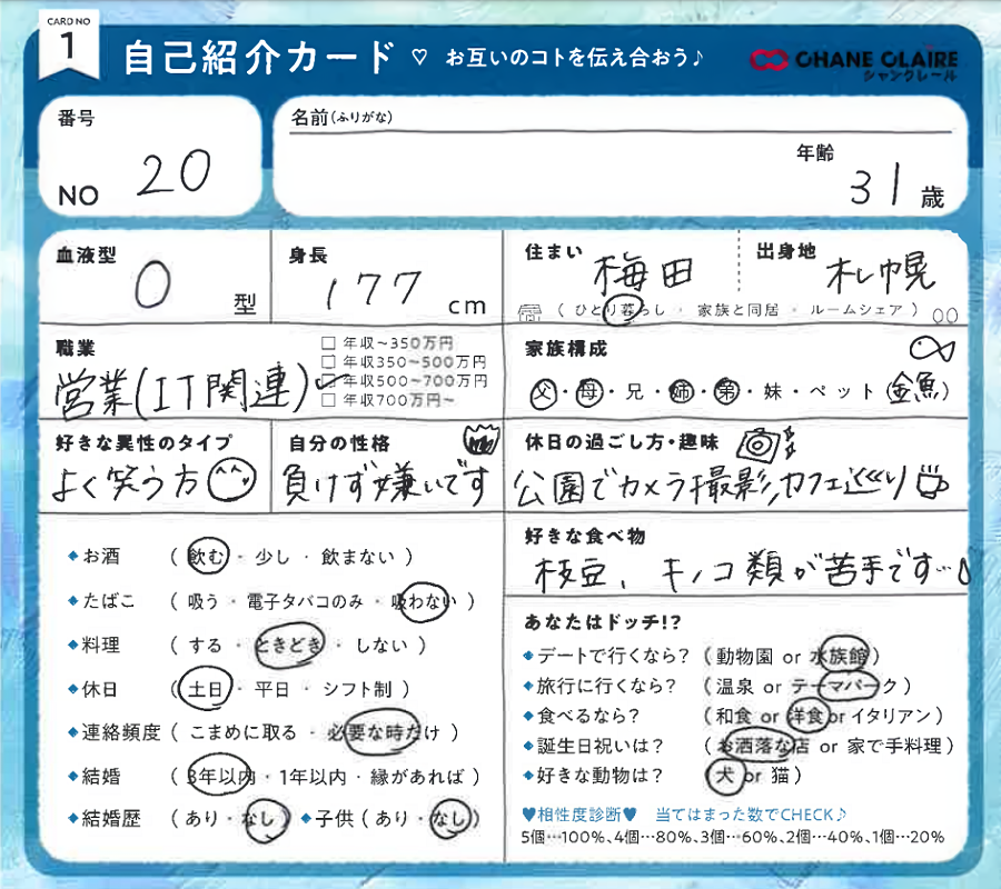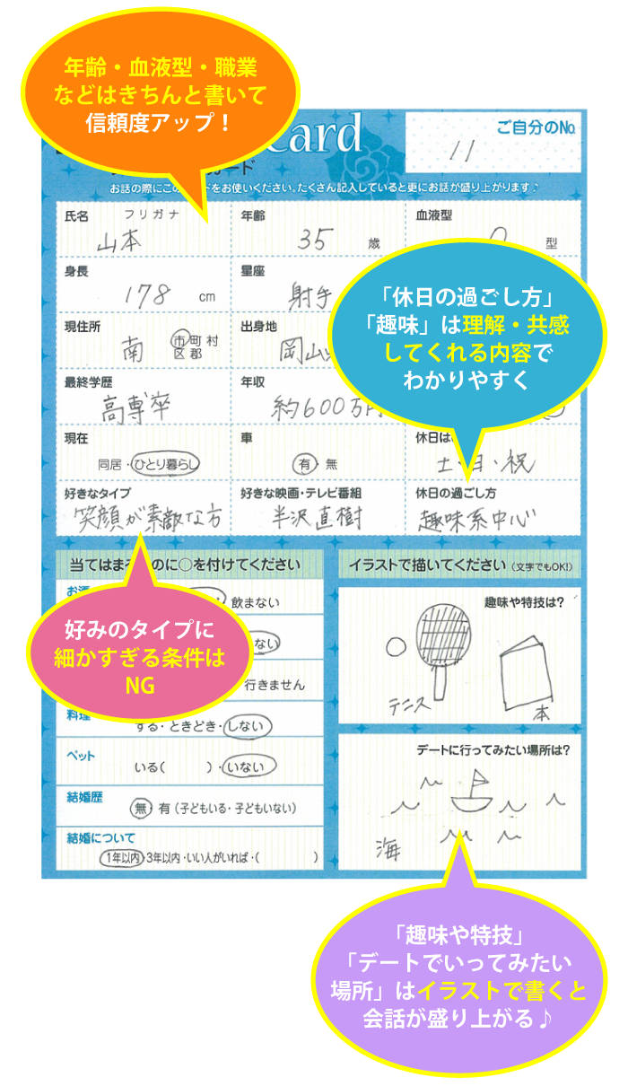 婚活パーティの「プロフィールカード」書き方のコツ!項目別・例文付きの解説も結婚相談所なら ゼクシィ縁結びエージェント。