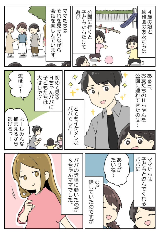 他人の夫に夢中なママ友、ついに気になるイケメンパパを発見お姫様気分なママ友ママリ。