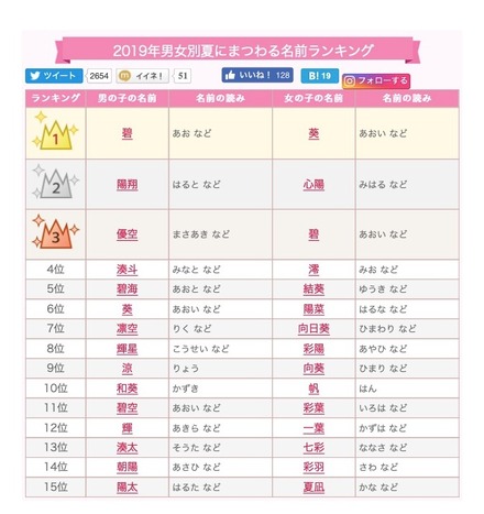 2019夏にまつわる名前ランキング、1位の読みは「あお・あおい」リセマム。