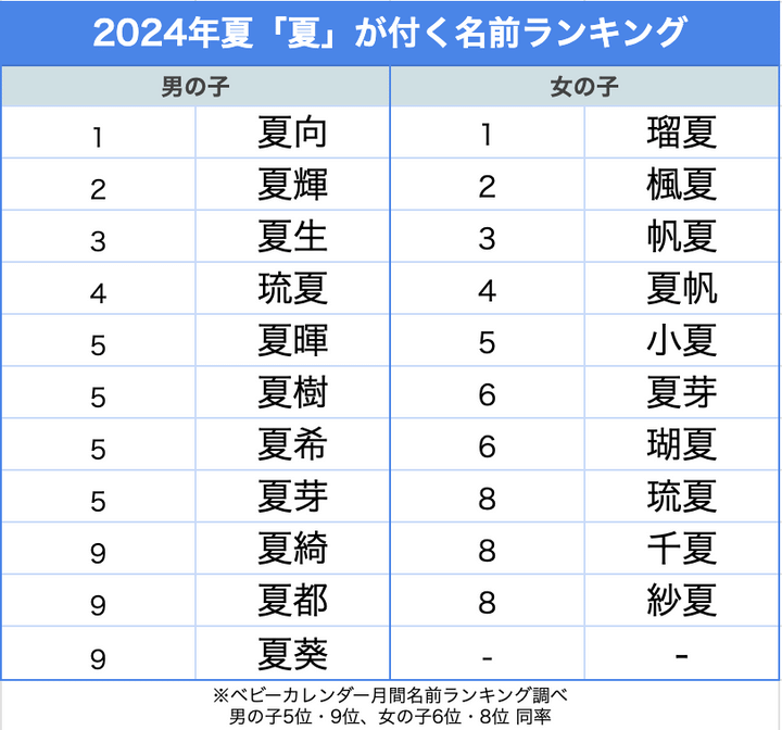 夏生まれの赤ちゃんの名前 マリンネーム が増加!「夏」「海」「凪」を使った名前が人気!2024年『7月生まれベビーの名付けトレンド』発表!株式会社ベビーカレンダーのプレスリリース。