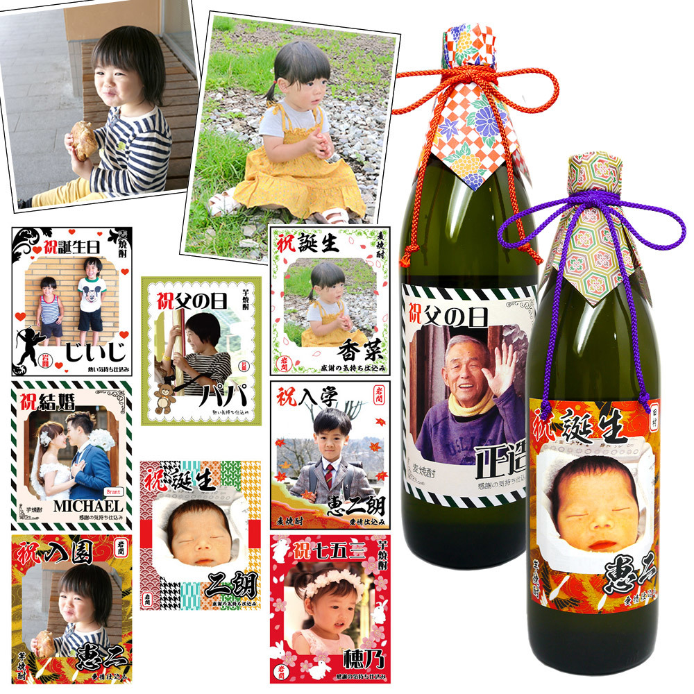 写真ラベルの焼酎☆麦焼酎と芋焼酎から選べる☆ 900ml 選べるデザイン!内祝い・誕生祝い・出産祝い 名入りラベル 父の日 古希祝い 結婚祝い 名入れ酒 送料無料-名入れ酒の富久屋 - プレゼント&ギフトのギフトモール。