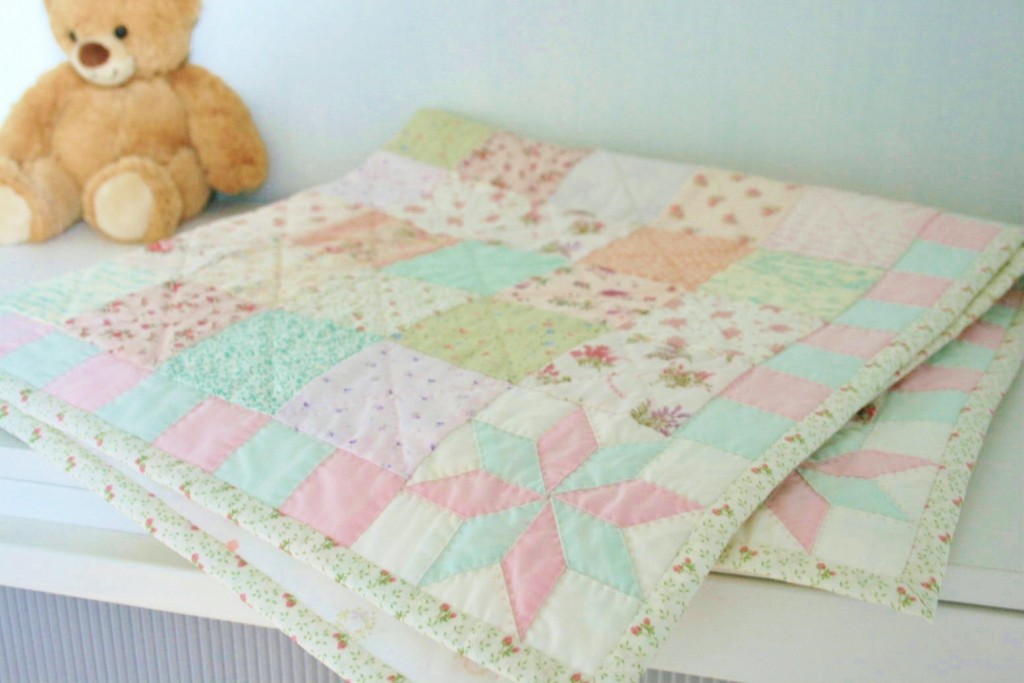 春色のおくるみ SOLD OUT ピンクとグリーンの星が可愛い!天使を迎えるためのベビーキルトシンプルでやさしい色のパッチワークキットベアーズポ。